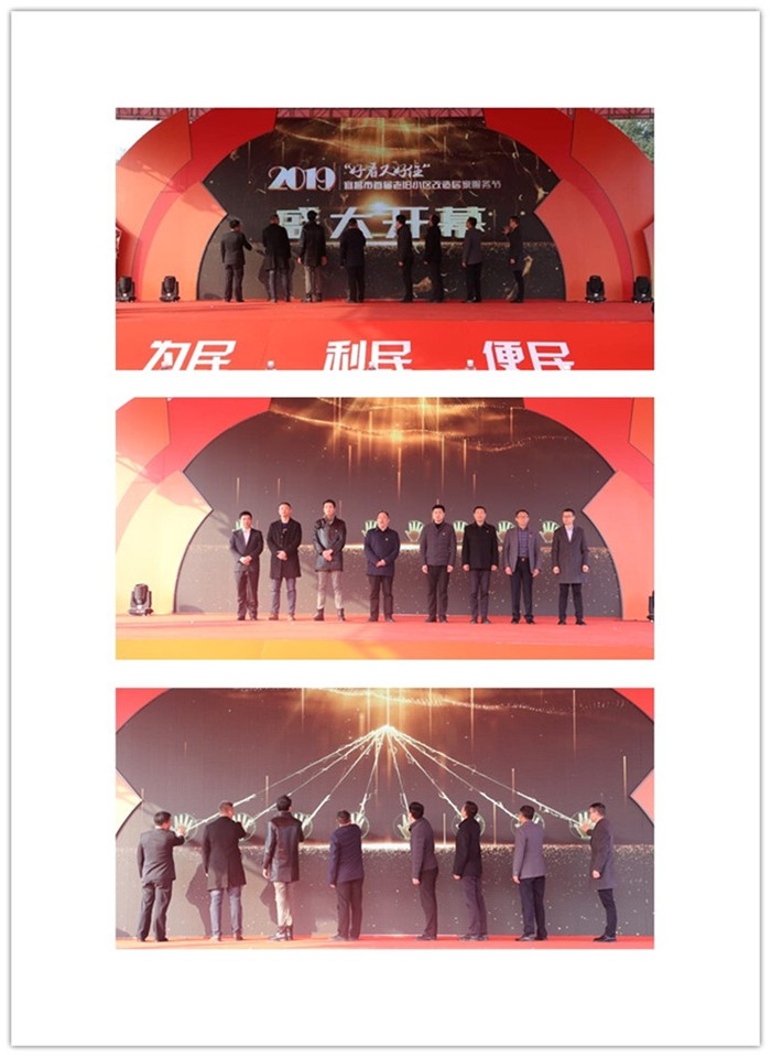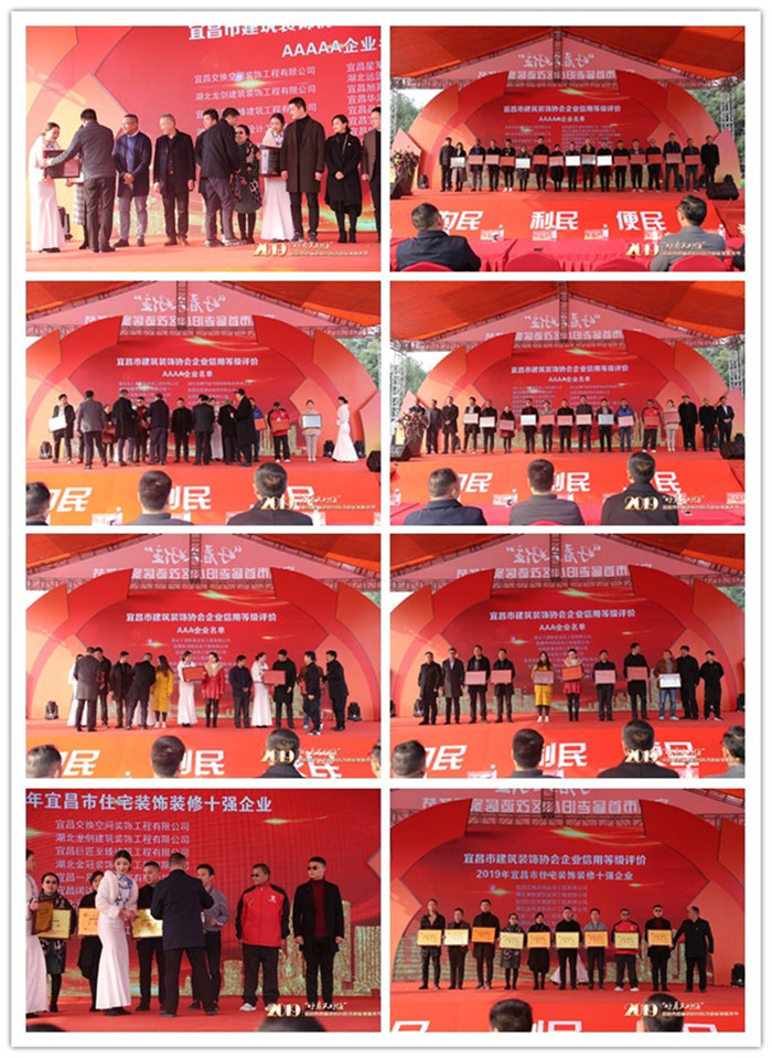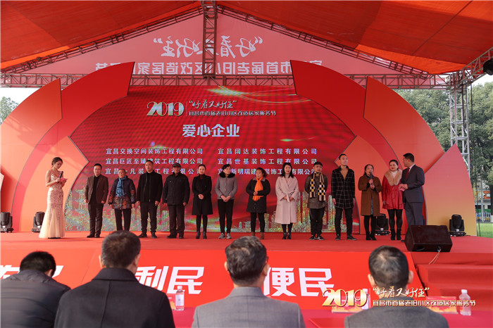 为向老旧小区改造试点工作管理单位和老旧小区居民推介诚实守信的优秀建筑装饰企业和家居建材企业,开幕式上,市建筑装饰协会发布了2019年宜昌市建筑装饰行业住宅装饰装修和家居建材企业信用评价结果及住宅装饰十强企业评选结果,并分别给获得“AAAAA”、“AAAA”、“AAA”信用等级的企业和获得“住宅装饰十强”称号的企业授牌。为扶贫帮困,奉献爱心,展示建筑装饰行业和装饰企业的奉献精神,在协会的统一组织下,由宜昌交换空间装饰工程有限公司、宜昌巨匠至臻建筑工程有限公司宜昌一凡装饰工程有限公司、宜昌阔达装饰工程有限公司、宜昌新明瑞建筑装饰工程有限公司、宜昌世基建设工程有限公司六家优秀装饰公司,联合“AAAAA”级建材家居企业,分别对筛选出的6个困难家庭实行免费装修,开幕式上,6家装饰公司进行了公开承诺。