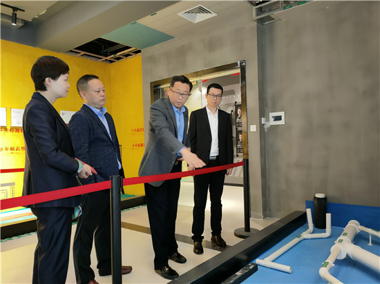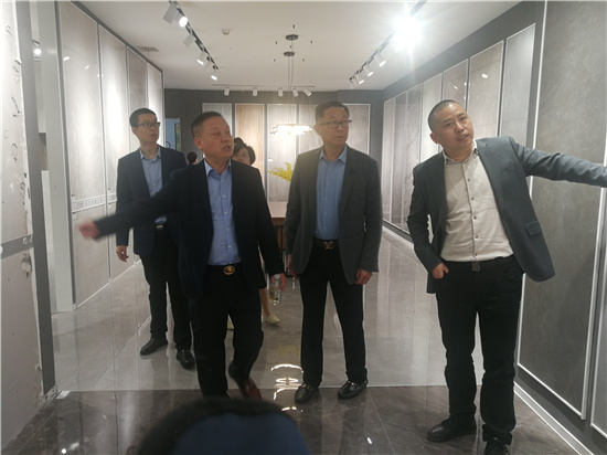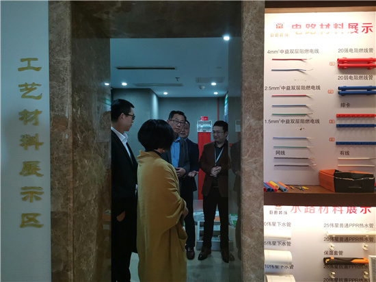 在走访调研中,彭康会长一行首先参观了企业的展示厅,观看了建筑装饰材料样品展示、新材料新工艺运用展示、自创工法和施工工艺流程模型展示。接着召开座谈会,听取企业相关情况汇报,共同探讨推动装配式装修技术运用落实落地和建筑装饰行业高质量发展。
