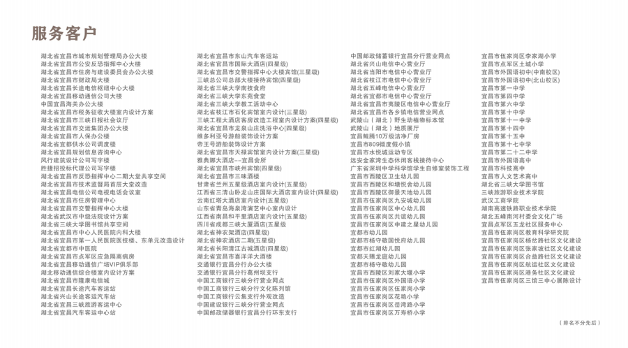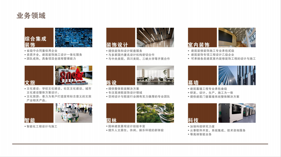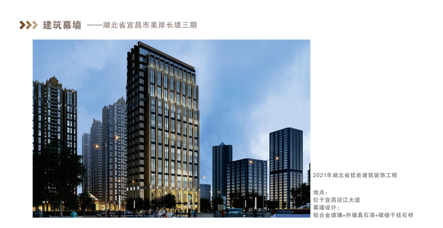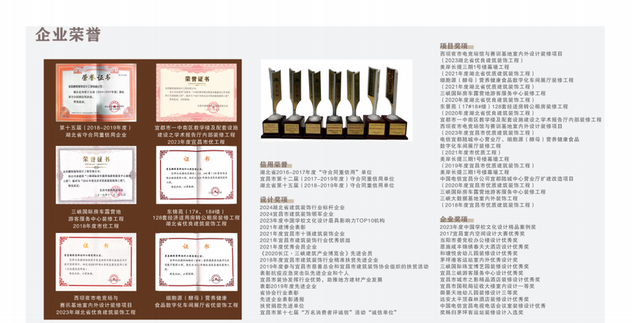 公司荣誉:数十个项目获评“湖北省优质建筑装饰工程奖”“宜昌市优质建筑装饰工程奖”。并有“宜昌市优秀建筑业企业”“湖北省建筑装饰标杆企业”等荣誉。公司连续多年获评“湖北省守合同重信用企业”“建筑装饰行业十强”。